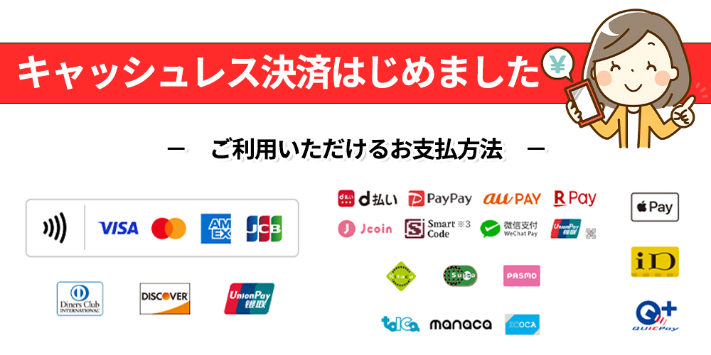 また、キャッシュレス決済をご利用いただくことで、お会計時のお時間短縮やレジでのお金のやり取りが不要となるため、より快適なお買い物をお楽しみいただけます。